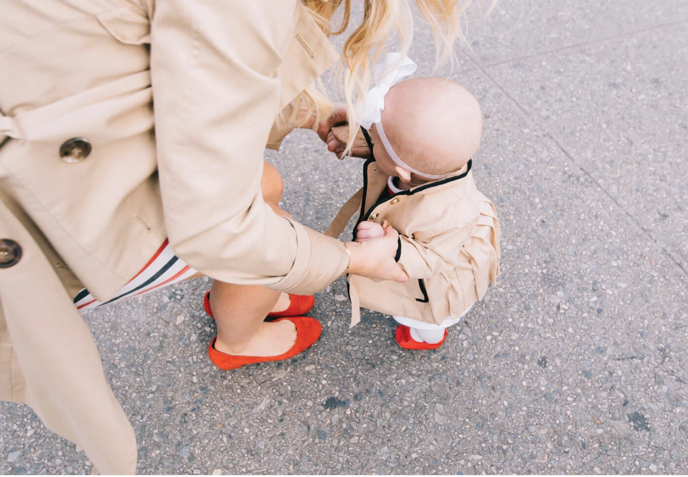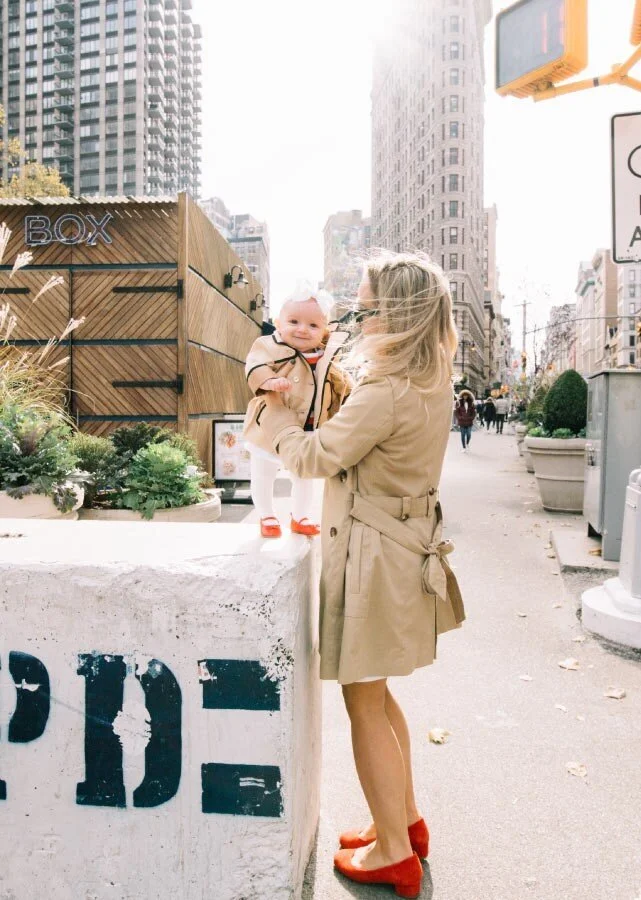 Sincerley Jules Dress // Calvin Klein Trench Coat // Red Halogen Shoes Jack & Janie Baby Trench Coat Old Navy Baby Girl’s Shoes Jack & Janie Baby Striped Dress {$sold out}