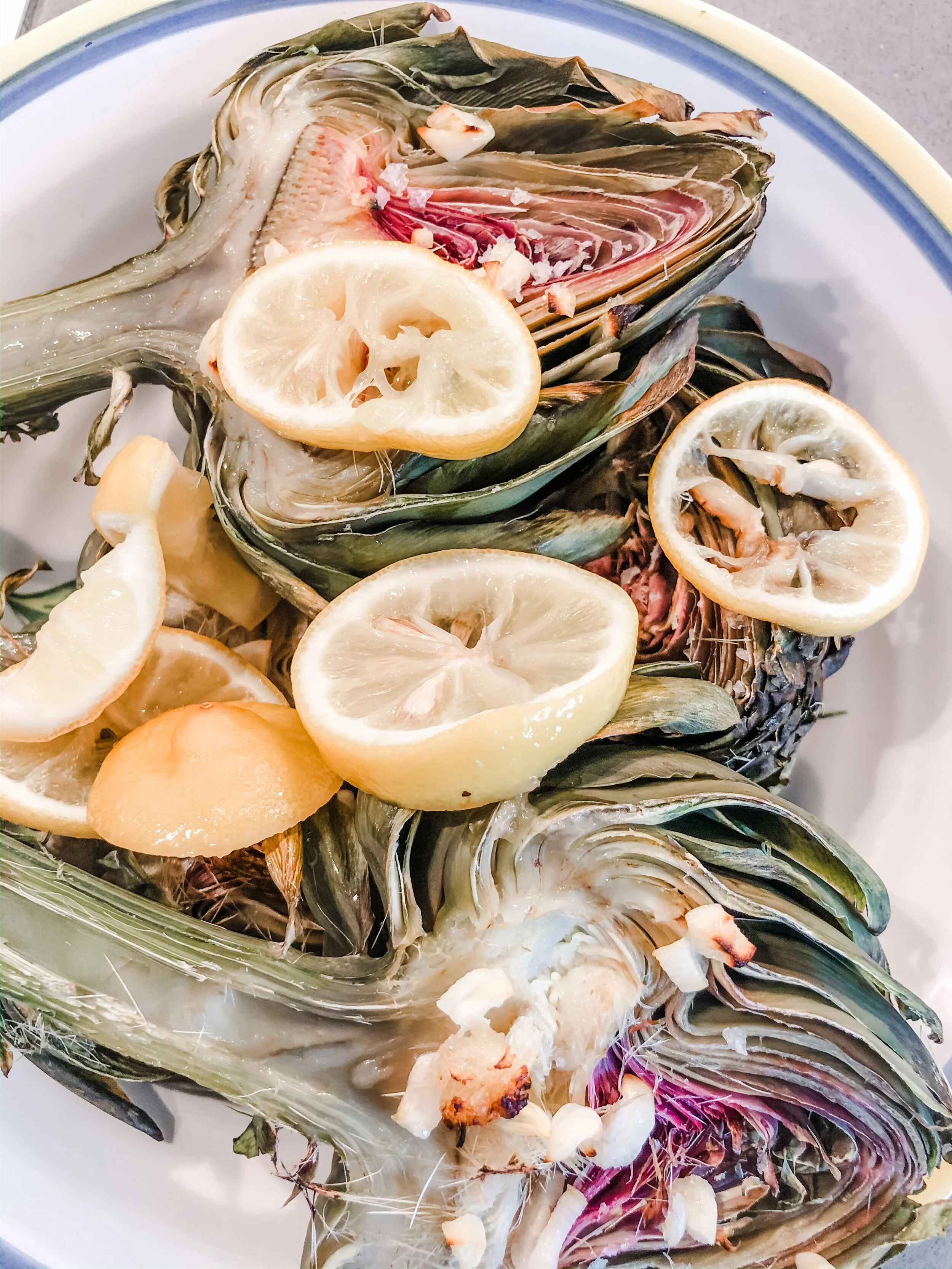 Spoon mixture over artichokes, add more olive oil and salt if needed