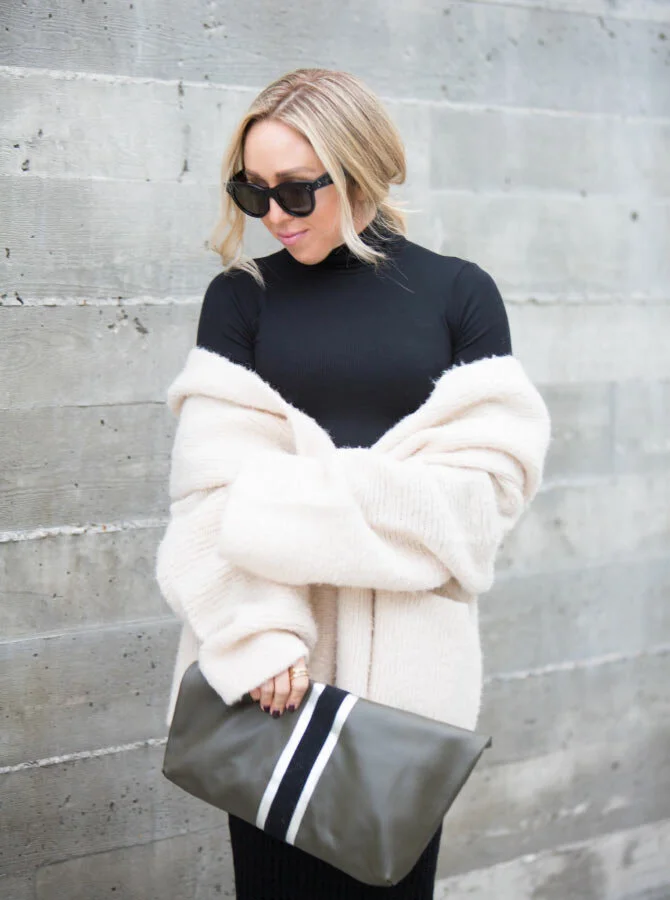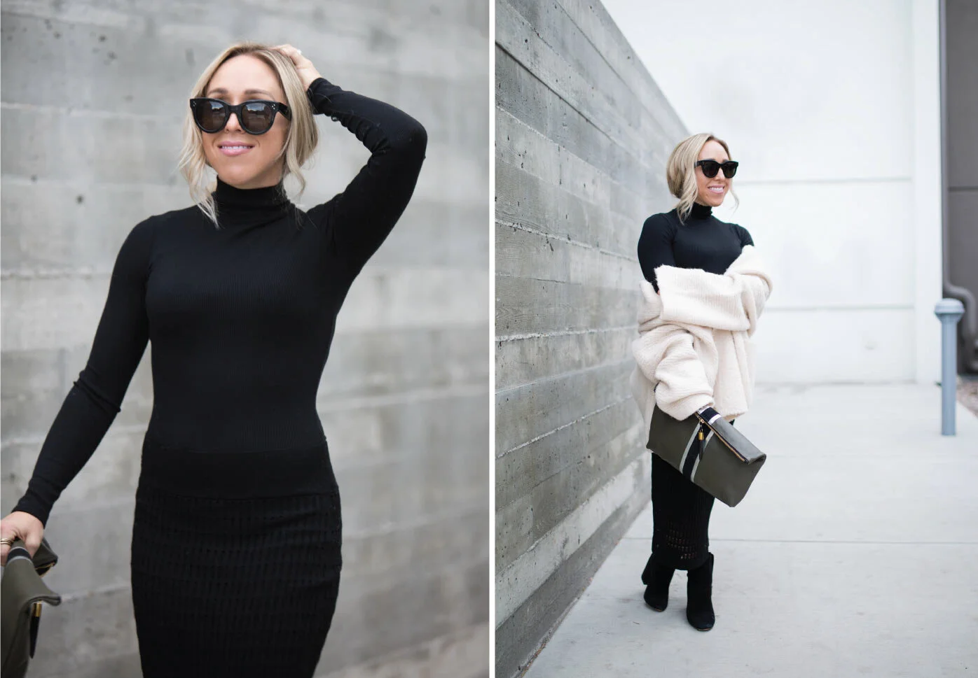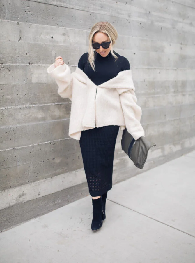 Many times I need to remind myself that wearing stilettos in sub-zero temps on icy sidewalks is just not practical! Opt for a bootie with a wedge or a chunky heel. Here are the Vince Camuto booties I am wearing in these pics, they are perfect. Also, invest in a pair of Sorel booties, these can pair great with tights, skinny jeans, or a long dress.