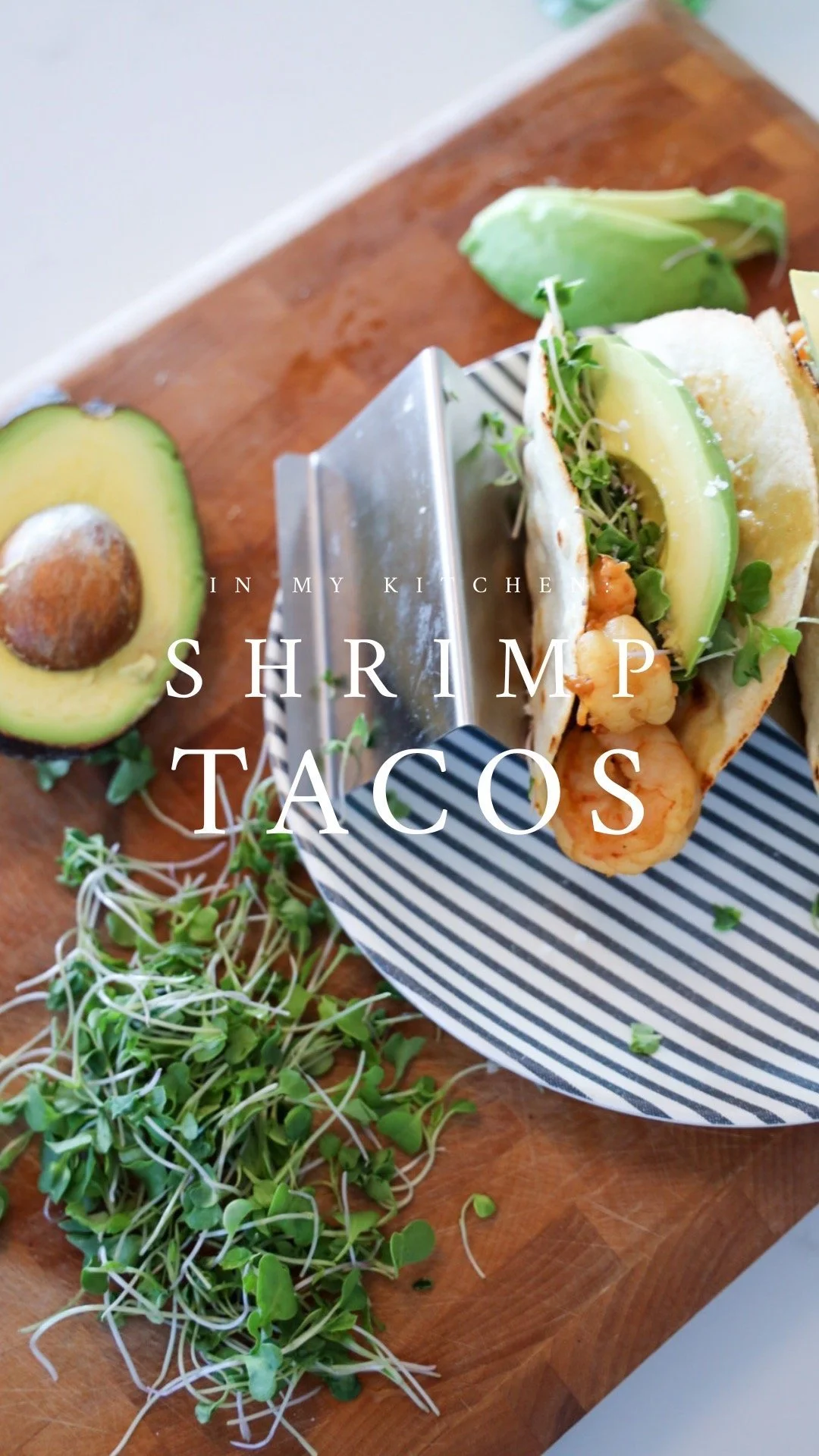 To build the tacos. I love Siete brand taco shells. Best method, in a small pan add olive oil then taco shell. Cook for about 30 second each side. Fill tacos shells with shrimp, cabbage, micro greens and avocado.