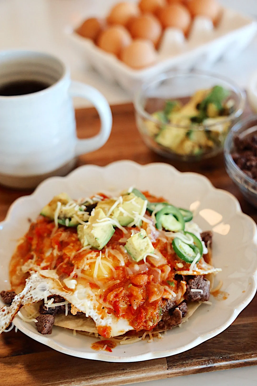 Spread about 2 tablespoons of the refried beans on a tortilla. Top with another tortilla, followed by another 2 tablespoons of the beans. Top with a fried egg and spoon the ranchero sauce on and around the egg. Repeat with the remaining beans, tortillas, and eggs. Add the cheese on top and finish with the cilantro and a few slices of avocado. Serve with the marinated red onions.