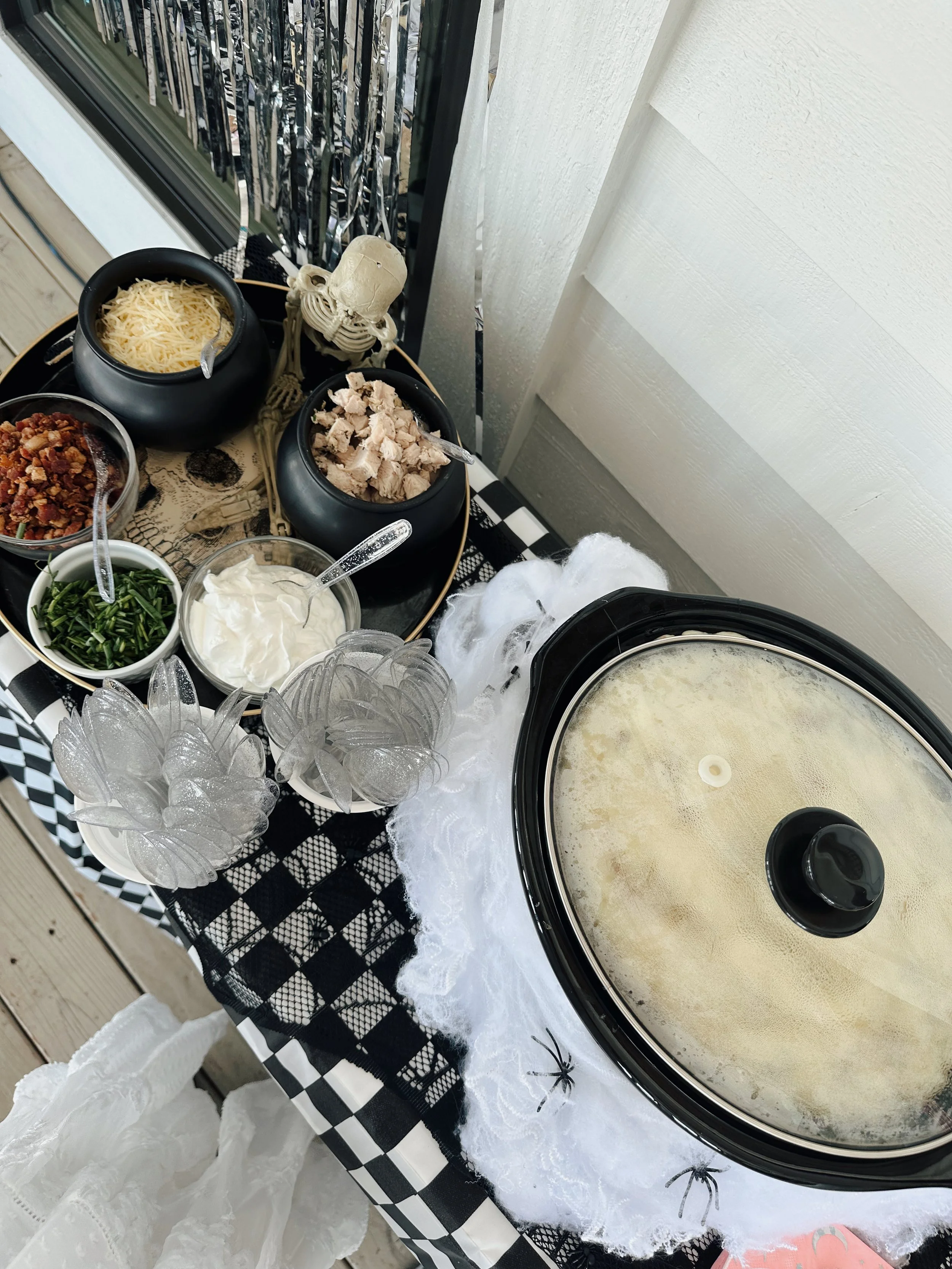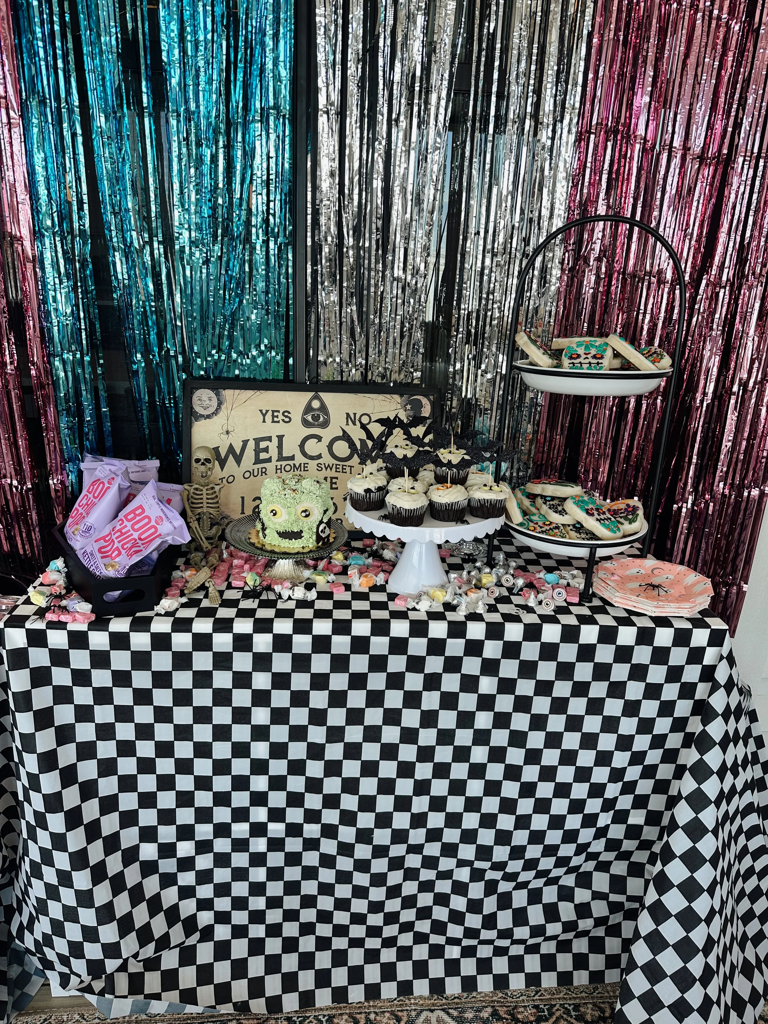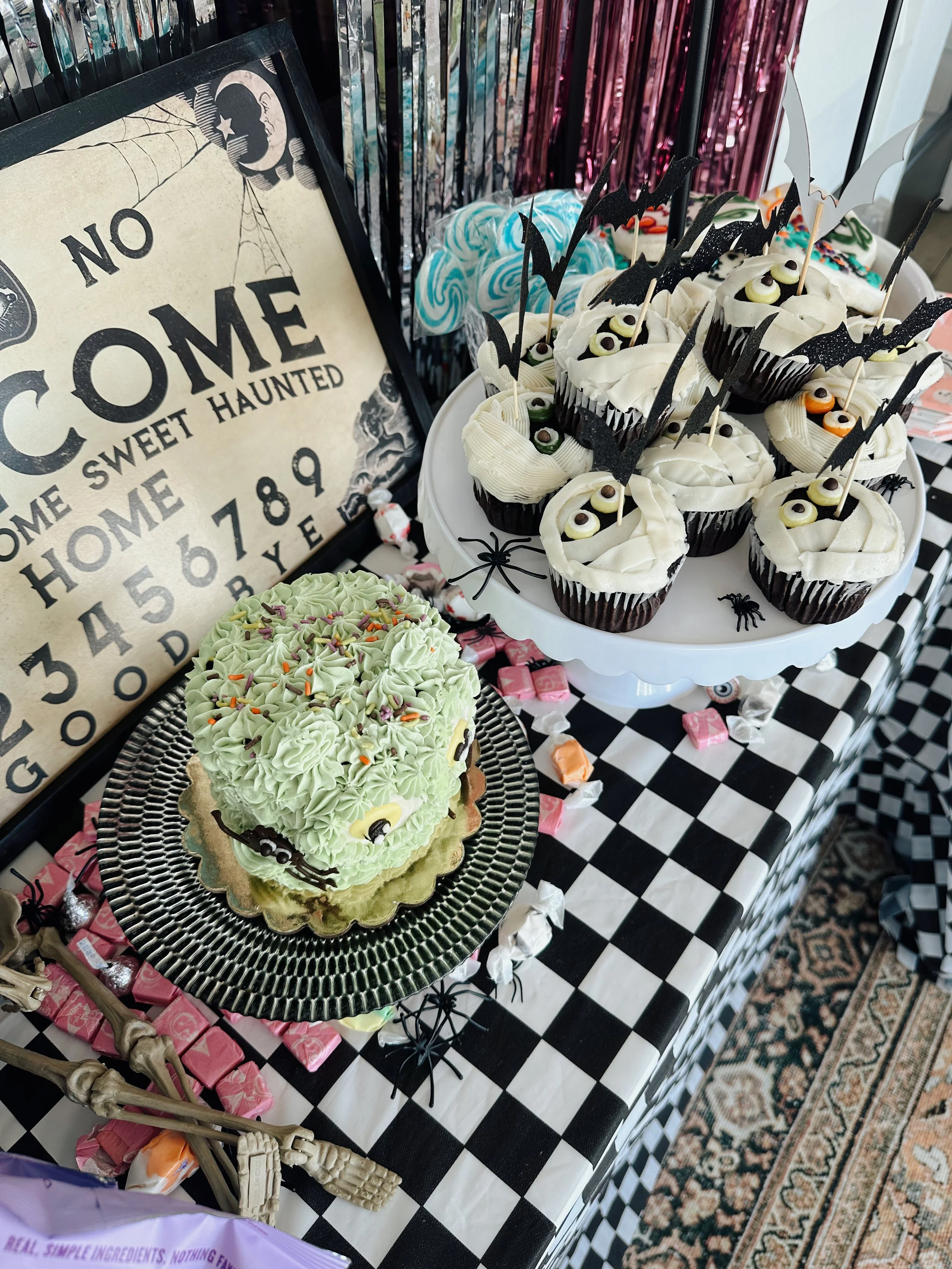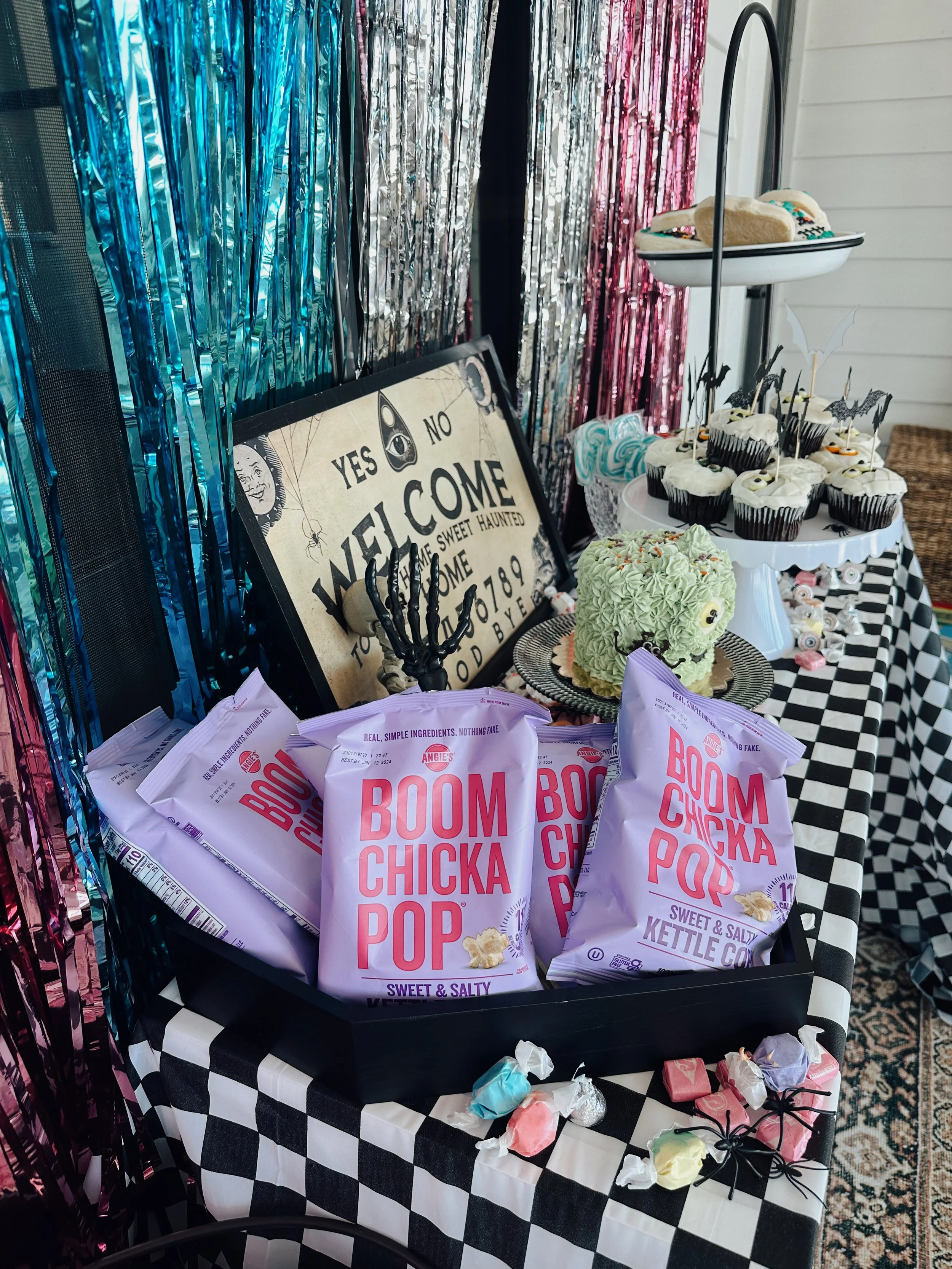 Our annual kids Halloween Party this year…Mini Monster Mash Bash! We love going all out for Halloween. This year was all about a fun disco dance party for the kids. We created a little disco dance floor with a great playlist. Food was a mashed potato bar, which we thought was fitting for a monster mash. Of course lots of candy, cupcakes and a monster cake.