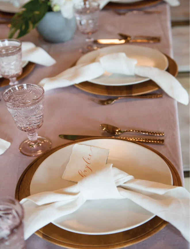 Montana Party Rentals provided all of the rental items and did a phenomenal job. The tables were rustic with velvet blush tablecloths, gold accents, and blush vintage glassware.