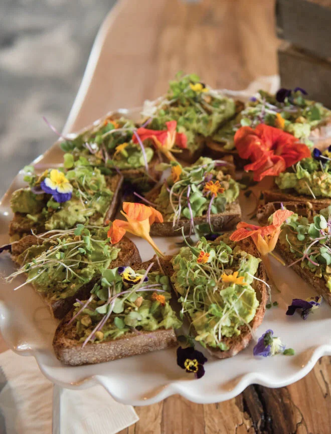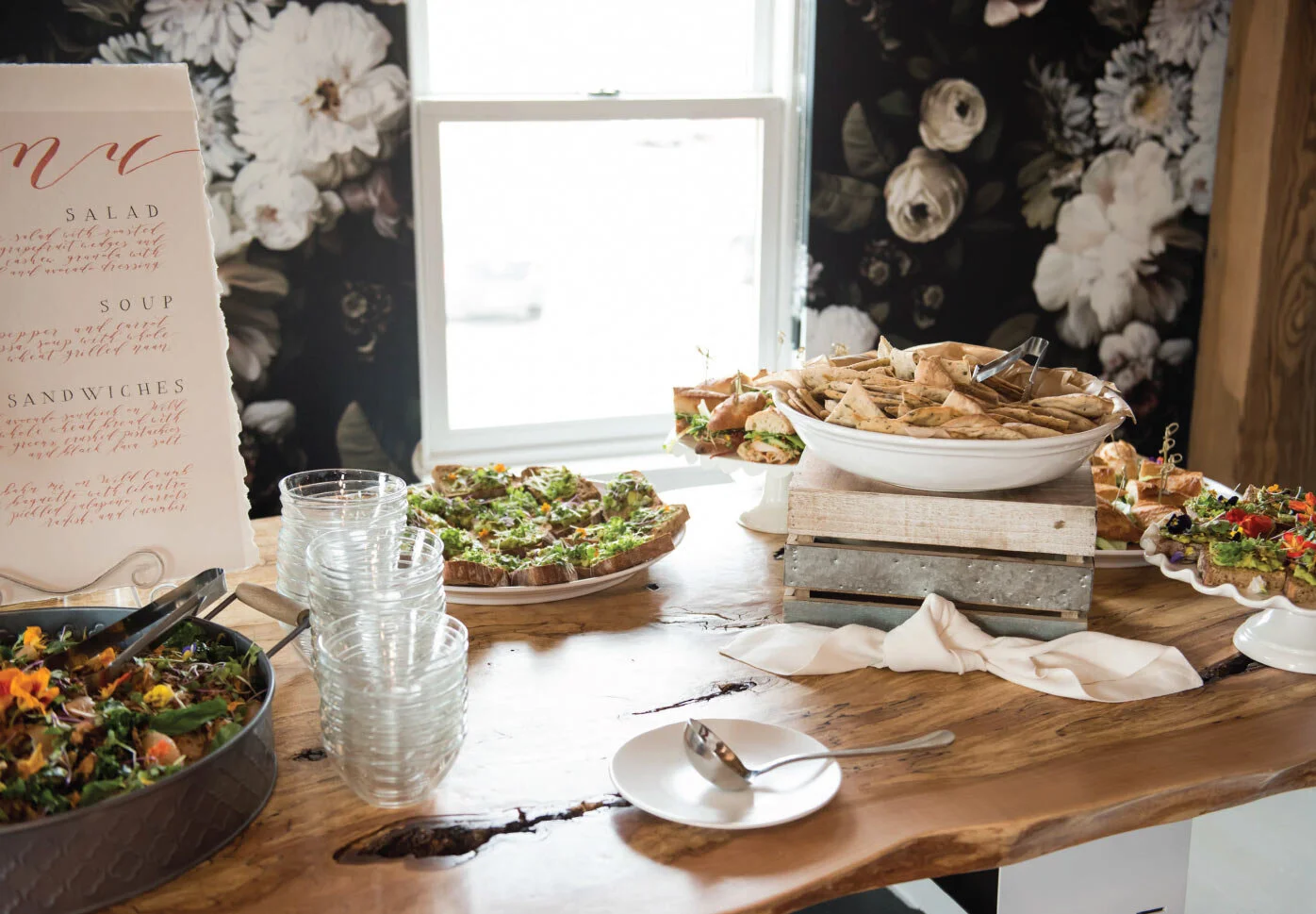 All of the delicious food came from Food For Thought Catering. We decided on a lunch/brunch theme as the shower was from 12pm to 2pm. The spread consisted of a beautiful chopped kale salad, a roasted pepper & carrot soup, avocado toast (obviously), and a chicken sandwich on a french baguette. So so good!