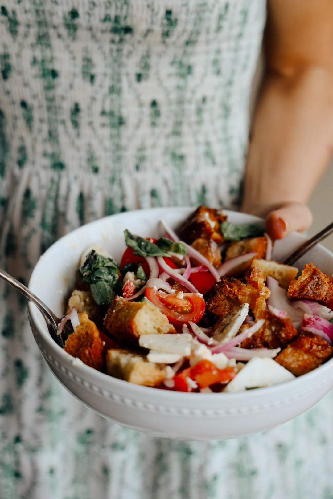 My sister and I were just saying how we want to embrace the European summer vibes at home this season. And this homemade Tomato Panzanella Salad featuring ripe summer tomatoes transports me back to the sunny streets of Italy.