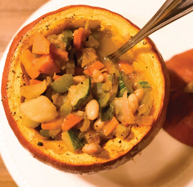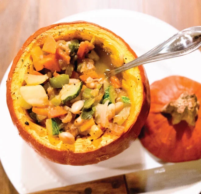 Remove pumpkins from the oven, scoop vegetable mixture into each pumpkin. Make sure add the broth to the pumpkin mixture. Roast in the oven for 30 minutes.