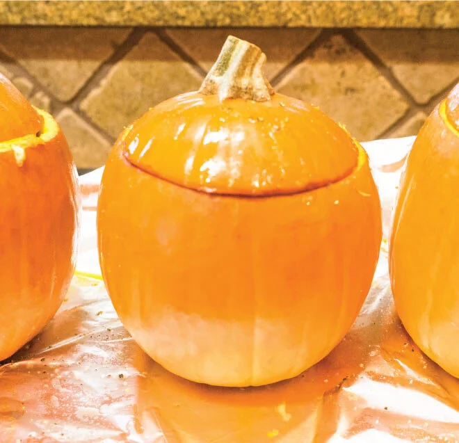 Preheat oven to 400 degrees. Cut off tops of the pumpkin, remove the insides. On a lined baking sheet, place pumpkins, drizzle olive oil, salt & pepper. Cook for 30 minutes.