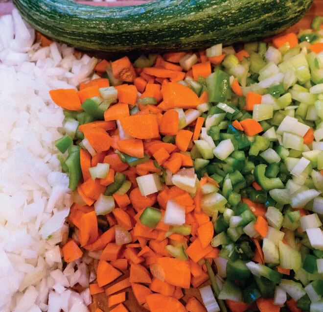 In a large pot or cast iron Dutch oven, heat olive oil, add onions and garlic. Sauté until brown. Add in carrots, celery, zucchini, potatoes, season with salt, pepper, red pepper flakes, chili powder, and dried oregano. Sauté for 5 minutes.